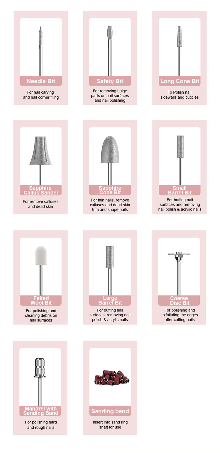 Professional Nail Drill Kit, Easy to Use: The Karrong Electric Nail Grinder includes all the necessary tools for both manicure and pedicure. It comes with an electric nail file, 9 high-quality stainless steel drill bits, an 360° LED light for precise filing, 100pcs Sanding Bands,a dust shield, and a Type-C charging cable,also comes with a storage bag for convenient organization. Its pen-shaped design makes it comfortable to hold and use, making it especially user-friendly for beginners