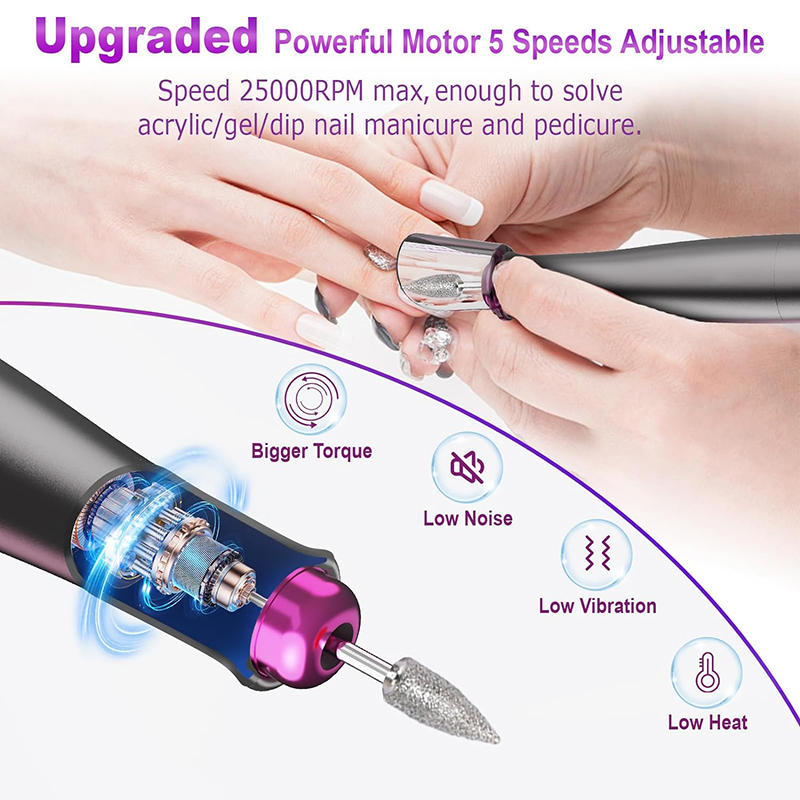 Aluminiumslegering med motor av høy kvalitet, Profesjonell Nail Drill høyhastighets rotasjon og effektiv varmespredning på samme tid. Motor med høy konsentrisitet, sterk og jevn effekt, kontinuerlig lav vibrasjon, lav støy og lav varme, noe som gjør neglepleien din mer effektiv og komfortabel.