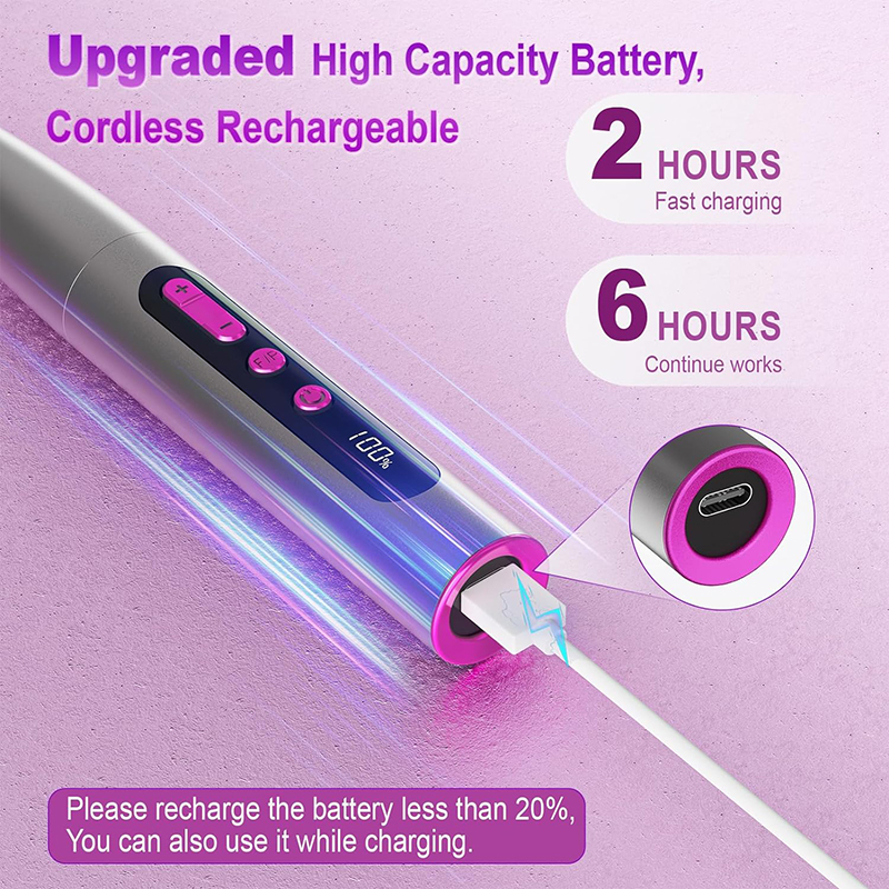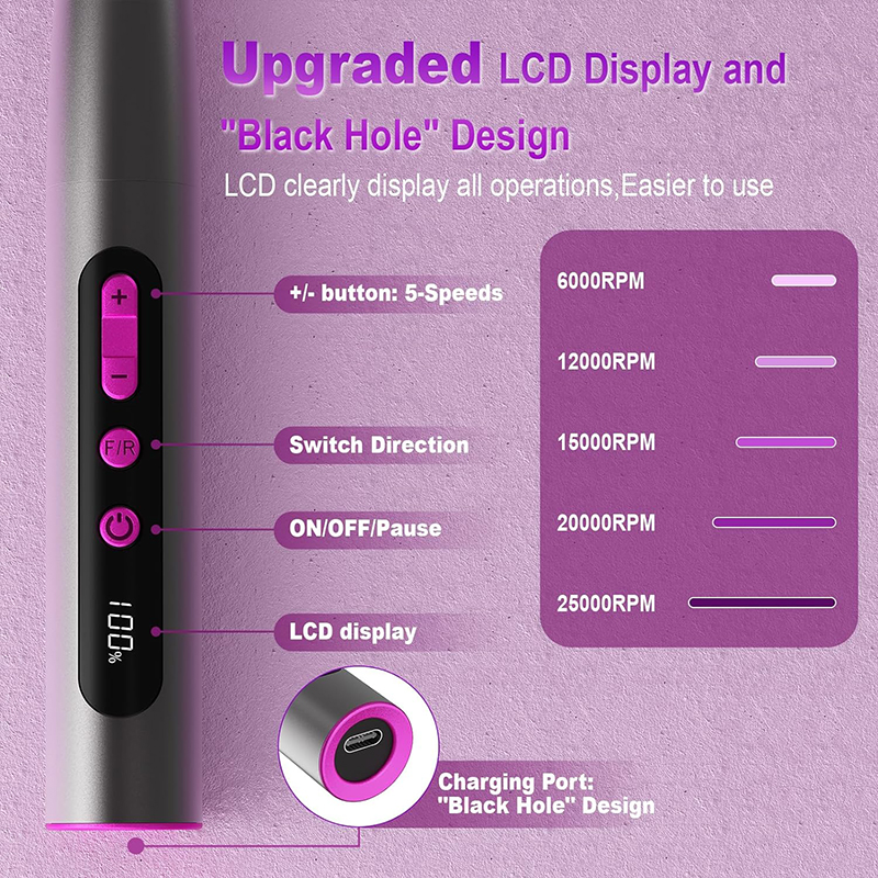 elektrisk spikerbor Oppgradert batteri med høy kapasitet, 2 timer Hurtiglading og 6 timer Fortsett fungerer. Elektrisk neglefil passer til din USB-strømadapter, bærbar PC, mobilstrøm osv. Hvis den trådløse spikerborekraften er mindre enn 20 %, kan du også bruke den mens du lader.