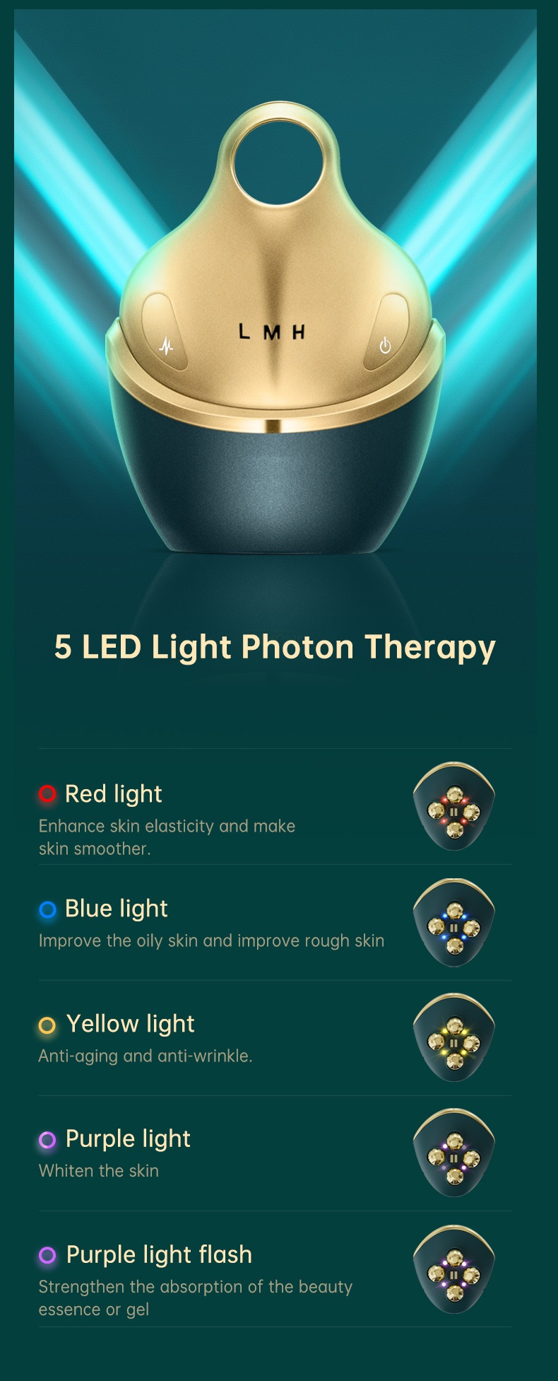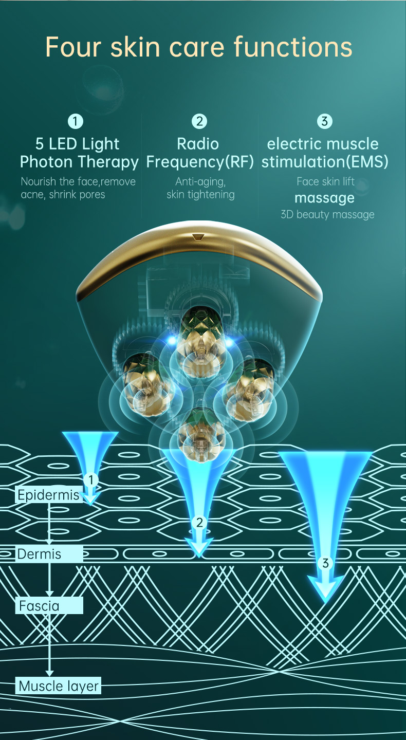 HVA ER FORDELENE? -- Skjønnhetsmaskin er en multifunksjonell antialdringsenhet som inkluderer radiofrekvensteknologi (RF) med rød/blå lysterapi, EMS for å redusere linjer og rynker, forbedre hudpenetrasjon og absorpsjonsevner, etc.