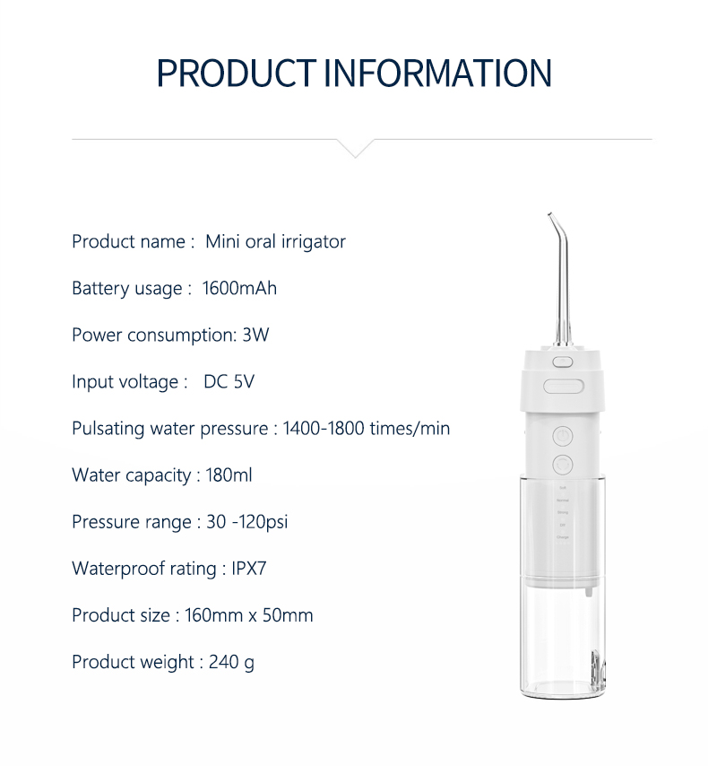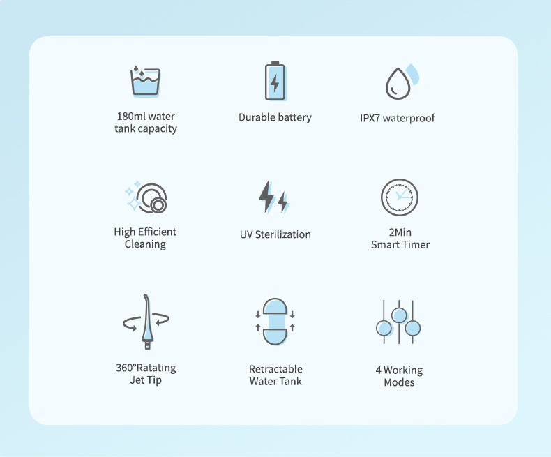 Denne vanntråden leverer høye vanntrykkpulser med 1400-1800 ganger per minutt, og fjerner effektivt 99,9 % av tannplakk for dyp rengjøring av tennene. Denne tannhakken med vanntråd masserer tannkjøttet, fremmer blodsirkulasjonen og løser orale problemer som dårlig ånde, kjeveortopediske tenner