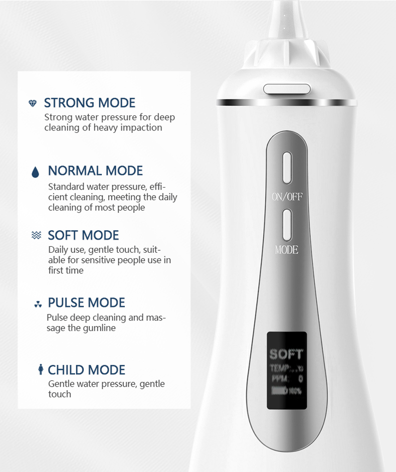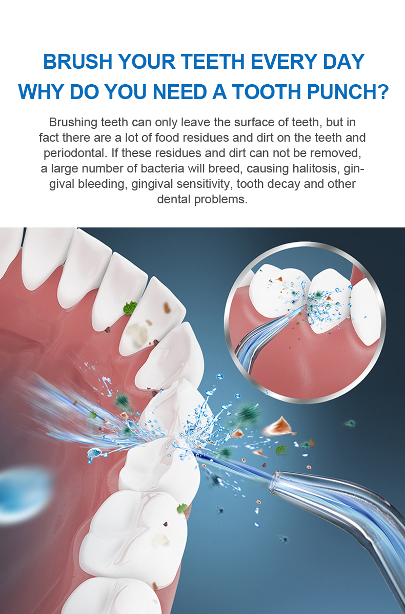 Denne vannplukkeren leverer høye vanntrykkpulser med 1400-1800 ganger per minutt, og fjerner effektivt 99,9 % av tannplakk for dyp rengjøring av tennene. Denne vannplukken masserer tannkjøttet, fremmer blodsirkulasjonen og løser orale problemer som dårlig ånde, kjeveortopediske tenner