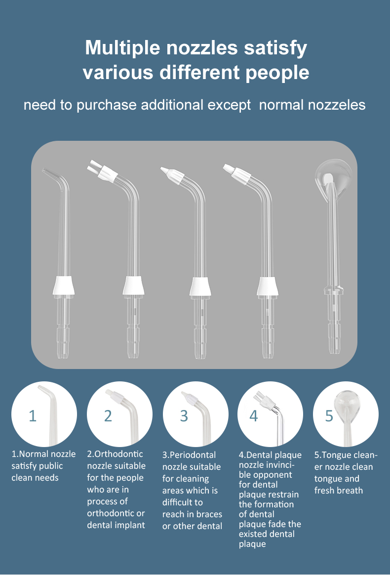 Profesjonelt evaluert av et amerikansk tannlegeteam, gir tanntråden vår fem praktiske moduser for å dekke ulike behov for 99 % forskjellige aldersgrupper, samtidig som den sikrer optimal ytelse og levetid. Det ergonomiske håndtaket og 6 utskiftbare dyser sikrer en komfortabel og allsidig opplevelse. Det er en omtenksom gave til bursdager, jul, Thanksgiving Valentines fars morsdag eller til å passe på dine kjæres munnhelse