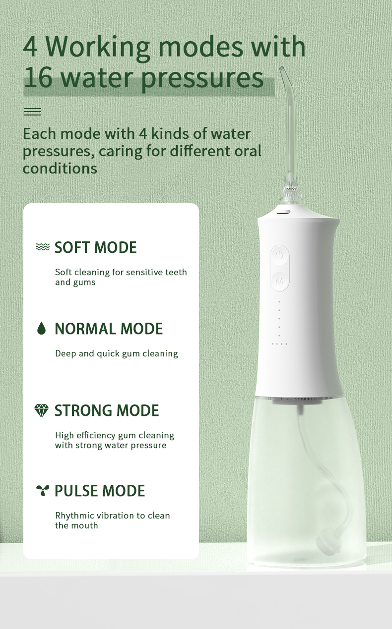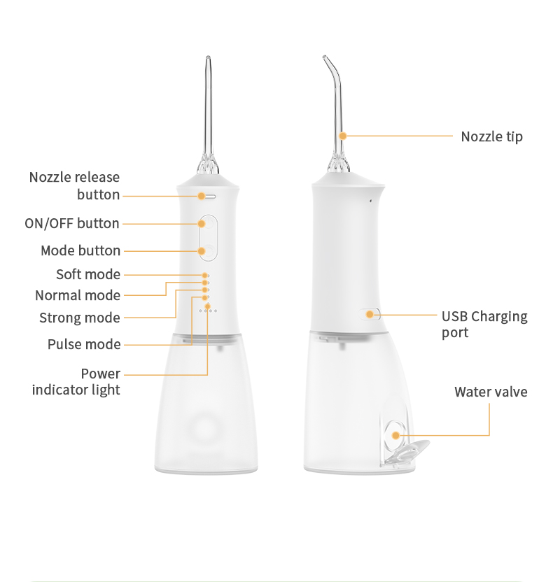 Denne vannplukkeren leverer høye vanntrykkpulser med 1400-1800 ganger per minutt, og fjerner effektivt 99,9 % av tannplakk for dyp rengjøring av tennene. Denne vannplukken masserer tannkjøttet, fremmer blodsirkulasjonen og løser orale problemer som dårlig ånde, kjeveortopediske tenner
