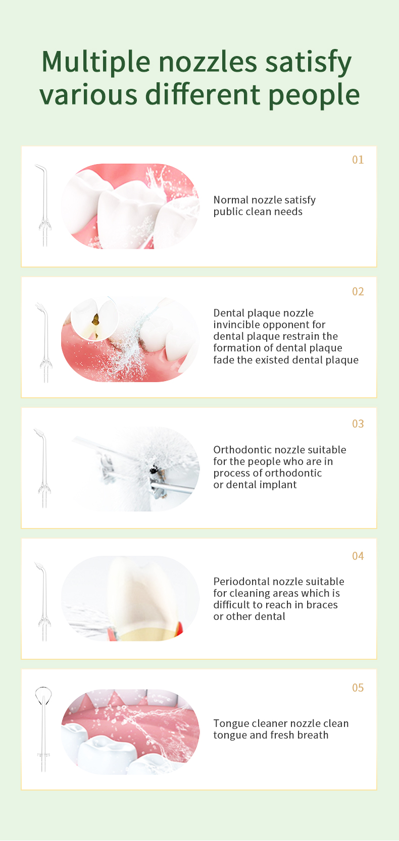 Profesjonelt evaluert av et amerikansk tannlegeteam, gir tanntråden vår fem praktiske moduser for å dekke ulike behov for 99 % forskjellige aldersgrupper, samtidig som den sikrer optimal ytelse og levetid. Det ergonomiske håndtaket og 6 utskiftbare dyser sikrer en komfortabel og allsidig opplevelse. Det er en omtenksom gave til bursdager, jul, Thanksgiving Valentines fars morsdag eller til å passe på dine kjæres munnhelse