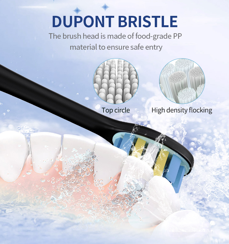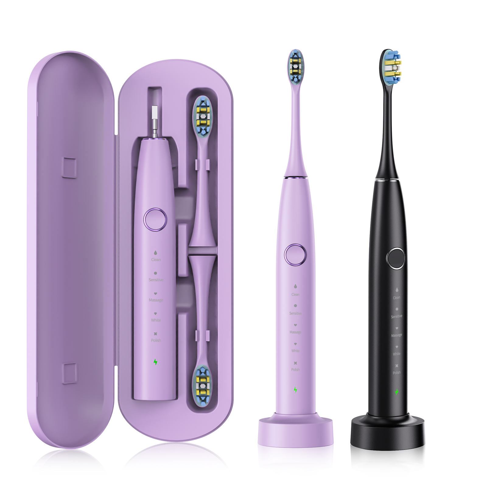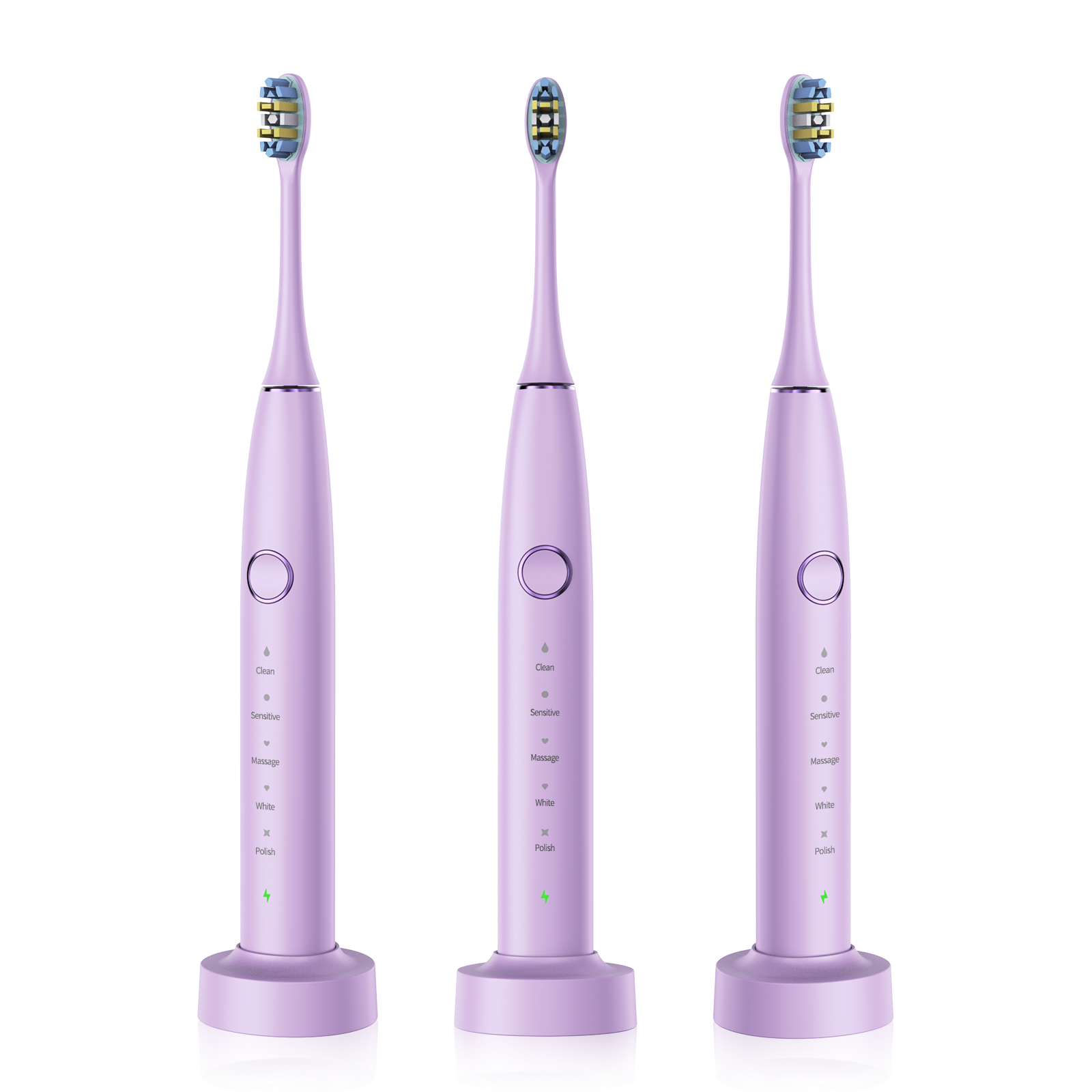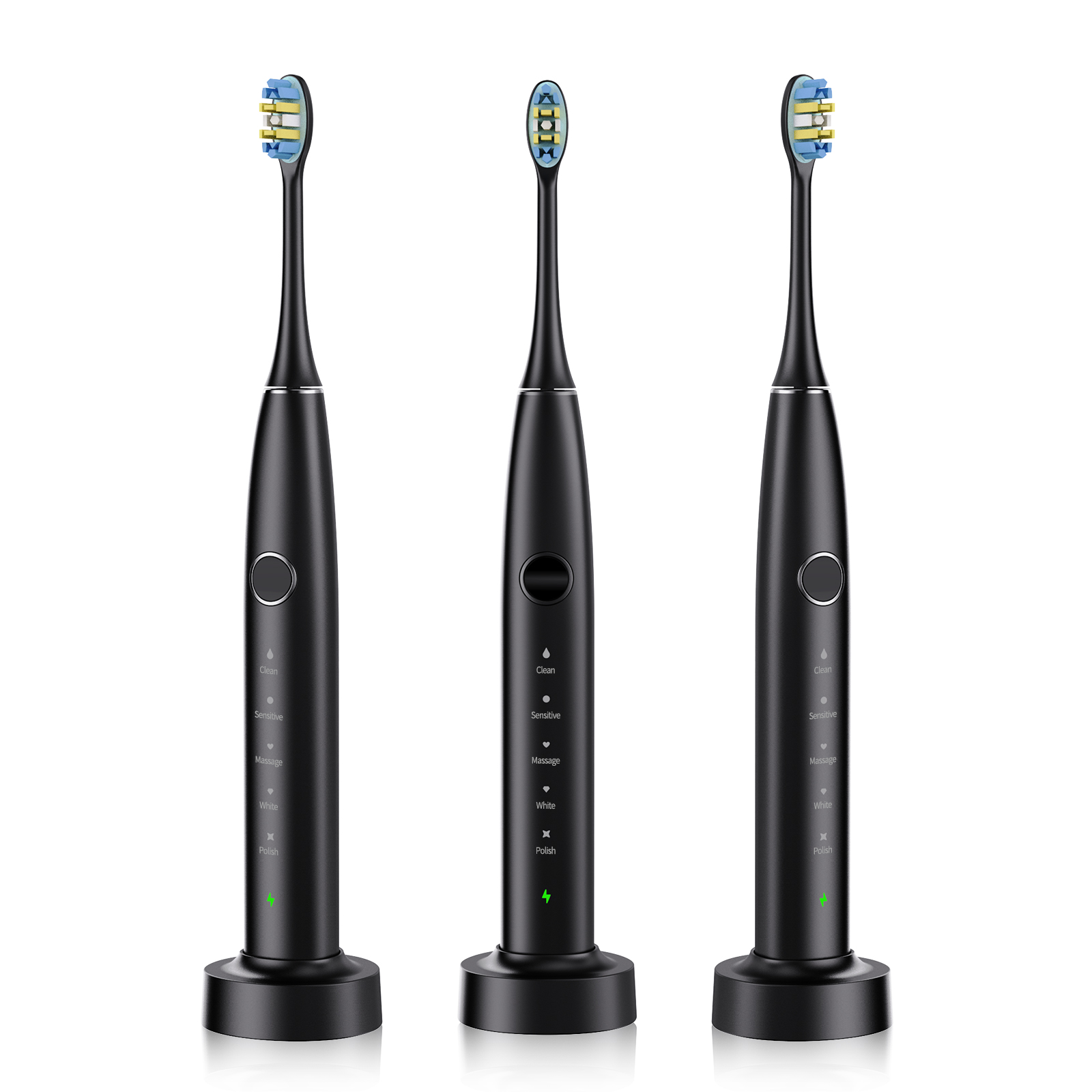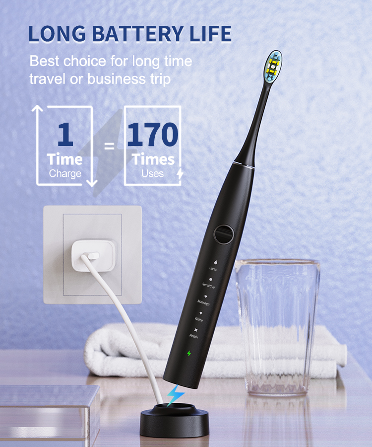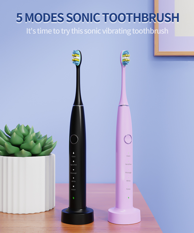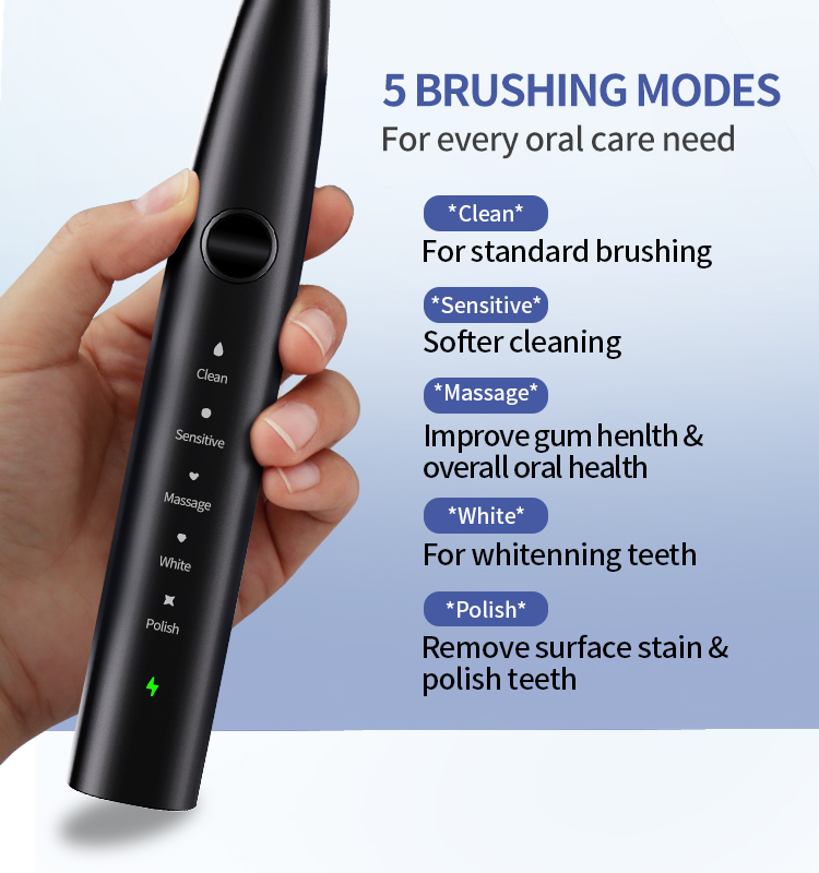 - 5 HØY YTELSE BØRSTEMODUS - Ren (skånsom), Hvit (sterk), Polsk (sterk inverteringsfrekvens), Mildere (skånsom inverteringsfrekvens) og Sensitive (myk) for å passe til forskjellige forhold i tannkjøttet, slik at du kan velge forskjellige moduser i henhold til dine preferanser og tannlegens anbefalinger.